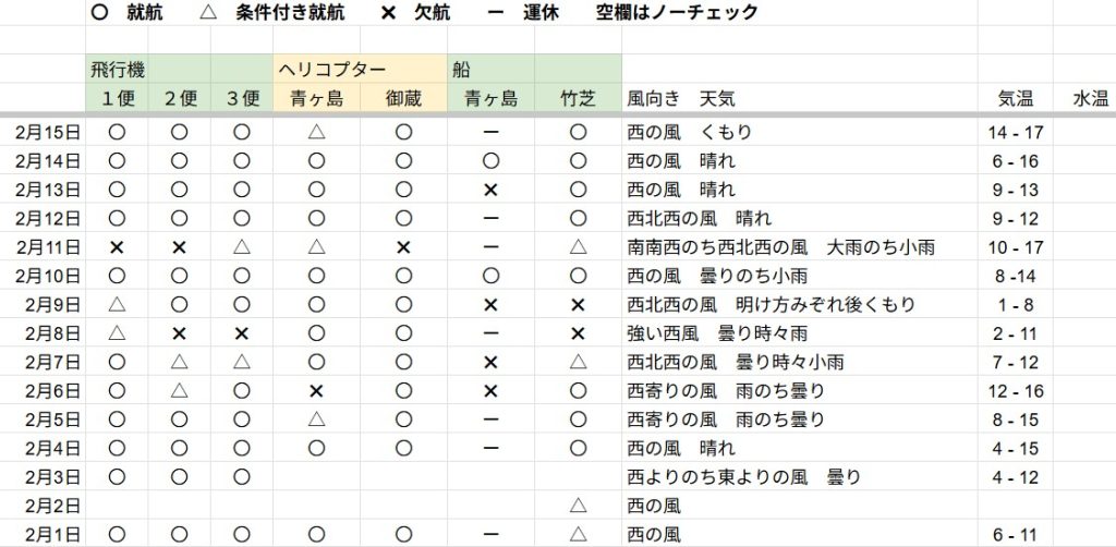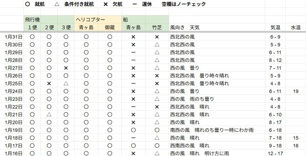 年末年始は穏やかだったのですが、その後は頻繁に寒波が到来し、その度に強風が吹き荒れました。そのためあおがしま丸が就航したのは、たった2回。橘丸も、就航さえすれ、条件付きではない日が3日ほどしかありませんでした。
